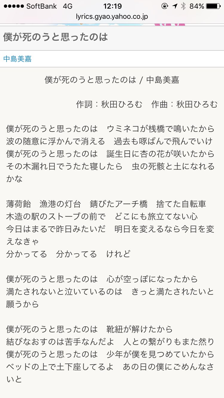 僕が死のうと思ったのは lyrics. 僕が死のうと思ったのは - 中島美嘉 6年前. 僕が死のうと思ったのは Lyricist秋田ひろむamazarashi Composer秋田ひろむamazarashi 僕が死のうと思ったのは ウミネコが桟橋で鳴いたから 波の随意に浮かんで消える 過去も啄んで飛んでいけ 僕が死のうと思ったのは 誕生日に杏の花が咲いたから その木漏れ日でうたた寝したら. 僕が死のうと思ったのは ウミネコが桟橋で鳴いたから 波の随意に浮かんで消える 過去も.